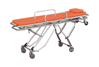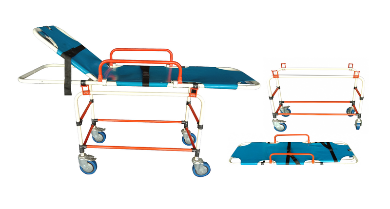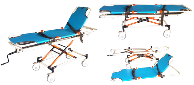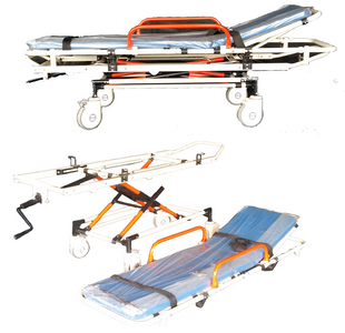 ALL ALUMINUM ,Roll in design makes Single person operated loading and unloading easy. Legs fold under cot automatically as cot enters vehicle. Legs automatically lock in place as cot rolls out and under carriage unfolds. High density foam cushion with PVC vinyl cover is an excellent back support and non infectant , with three restraints. The back rest can be adjusted to 80 degrees and the foot rest can be inclined to 15 degrees. Made from aluminum alloy , this stretcher is light and tough and has a 20 times more life cycle than regular Mild Steel ones.